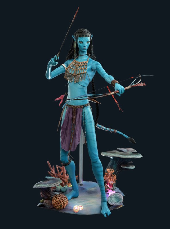 非常に詳細なネイティリのコレクタブルは約44cmの高さで、『アバター: 水の道』におけるネイティリの外観に基づいて巧みに制作されています。このアバターコレクティブルは、新しく開発された頭部彫刻、高度に詳細な髪彫刻と繊維製の髪植栽、羽根付きの彫刻されたヘッドピース、顔や体のパターンを捉えた繊細な塗装仕上げ、アームバンドやすべて彫刻されたガントレットを備えた慎重にデザインされた衣装、ダガー、矢、弓などのアイコニックな武器とアクセサリーが特徴です。