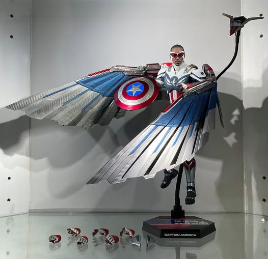 アントニー・マッキーが新しいキャプテン・アメリカとして演じる姿に基づいて巧みに作られたこのマーベルフィギュアは、フェイスゲイターとゴーグルを装備した新たに開発されたヘッド、青、白、赤のカラースキームの新しい戦術的なアウトフィットと星のエンブレム、キャプテン・アメリカの象徴的な盾、フライトバックパック、レッドウィングドローン、そして約80cmの幅を持ち、素晴らしいアクションシーンのために拡張された可動域で設計された巨大な翼の詳細な再現を特徴としています。
