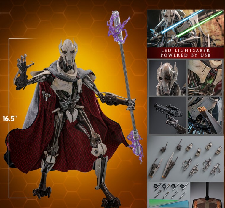この高度に詳細に作られたスター・ウォーズのコレクタブルフィギュアは、新たに開発されたヘッドに別々の動く眼球システムを装備しており、目の位置を調整可能です。ダイキャスト金属製のボディ構造により驚異的な可動域を実現し、将軍のアイコニックな四本の腕、USBで駆動されるLEDライトアップ機能付きのライトセーバー、巧みに仕立てられたワイヤー入りのケープ、交換可能なバトルダメージパーツ、エレクトロスタッフ、ブラスター、そしてディスプレイスタンドが付属しています!