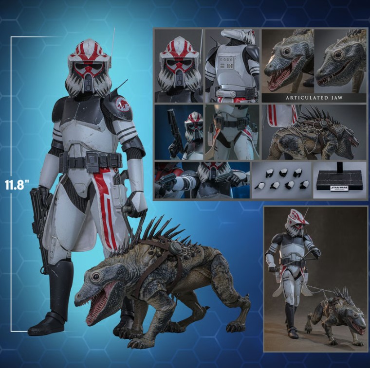 彼の側には、詳細なハーネス、メタル製チェーンのリード、ハンドルを装備したマシッフが立っています。マシッフは可動式の顎とやや可動する前肢と後肢を持ち、コレクターがトルーパーとトラッカーの絆を生き生きと表現できるようになっています。このマシッフアクセサリーの外観は、『クローン・ウォーズ』と実写のスター・ウォーズメディアの両方にインスパイアされており、クリーチャーのアニメーション起源を尊重しつつ、実写のリアリズムを取り入れています。すべては、スター・ウォーズのロゴとハウンドのキャラクター名プレートが付いた特別デザインのフィギュアスタンドに展示されており、このコレクティブルは共和国のより神秘的なオペレーターの一人への力強いトリビュートとなっています。