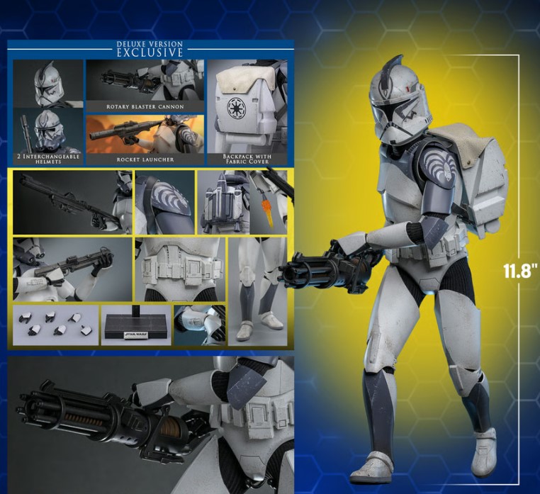 デラックスバージョンには、追加の交換可能なフェーズIクローントルーパーのヘルメット、フェーズIIヘルメット、回転ブラスターキャノン、ロケットランチャー、そして追加のディスプレイオプション用カバー付きのバックパックが含まれています!
