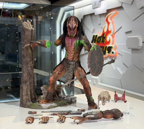 「ここまでだ。これ以上はだめだ。ここまでだ"- ナル Prey(獲物)』で対決が繰り広げられる中、フェラル・プレデターは沼地と森での命がけの追跡の末、重傷を負う。勇敢なコマンチ族の戦士ナルは、プレデター自身のテクノロジーを逆手に取り、マスクを奪い、標的レーザーを使って致命的なショットをプレデターの頭部に撃ち返す。体に傷跡が残り、手足が切断されたこの戦いの惨状は、狩りの残酷で生々しい結末を捉えている。 頭部は新規ペイントが施され、皮膚の質感は最終決戦の姿を正確に反映。交換可能な2セットの大あごが付属し、1つは開いた状態で、もう1つはプレデターの傷ついた状態を反映するために牙が折れている。プレデターのコレクティブルには、交換可能な6本の手と交換可能な切断された右腕も付属している。 全高約37cmのプレデターのボディは、戦闘でダメージを受けた塗装が施され、緑色の血と衝突による傷跡が再現されている。コスチュームには、ラメ入りスカートのユーティリティベルトとアンクルラップが付属。彼の武器には、リストシールド、磁石で装着可能なボルトガン、分離可能なコンビスティック、磁石で装着可能な収納状態のコンビスティック、ムチ、リストブレードが含まれ、プライ・プレデターを特徴づける原始的な武器とエイリアンの武器が混在している。赤色LEDライトアップ機能付きボーンマスク、バックパック、ベルトにぶら下がる2本のボーン、対決の舞台となった鬱蒼とした森を再現した森をテーマにしたジオラマフィギュアベース、そしてジオラマベースに取り付けることができる斧と2本の矢が付属し、ディスプレイを盛り上げます。